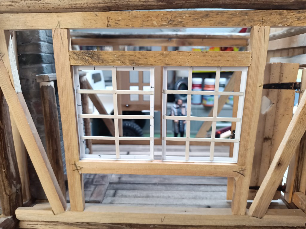 Die Industriefenster-Rahmen wurden aus Kunststoff-Winkelprofilen hergestellt. In der Realität ist dort ein Rahmen auch mit Winkel- und T-Profilen aufgebaut.