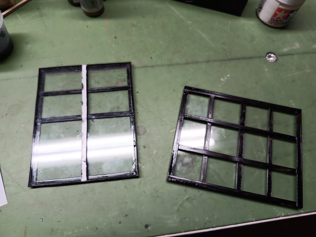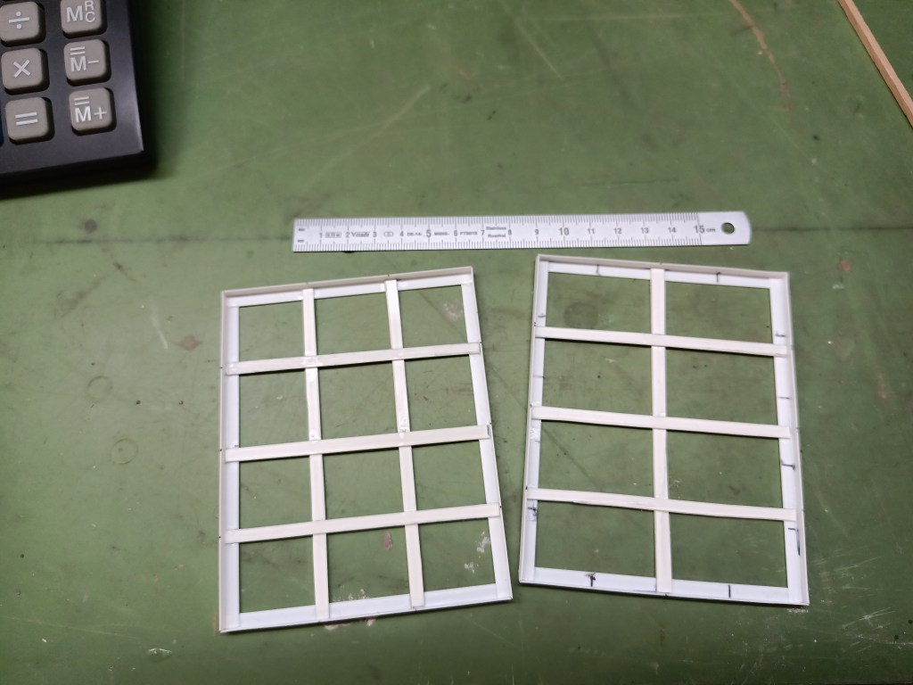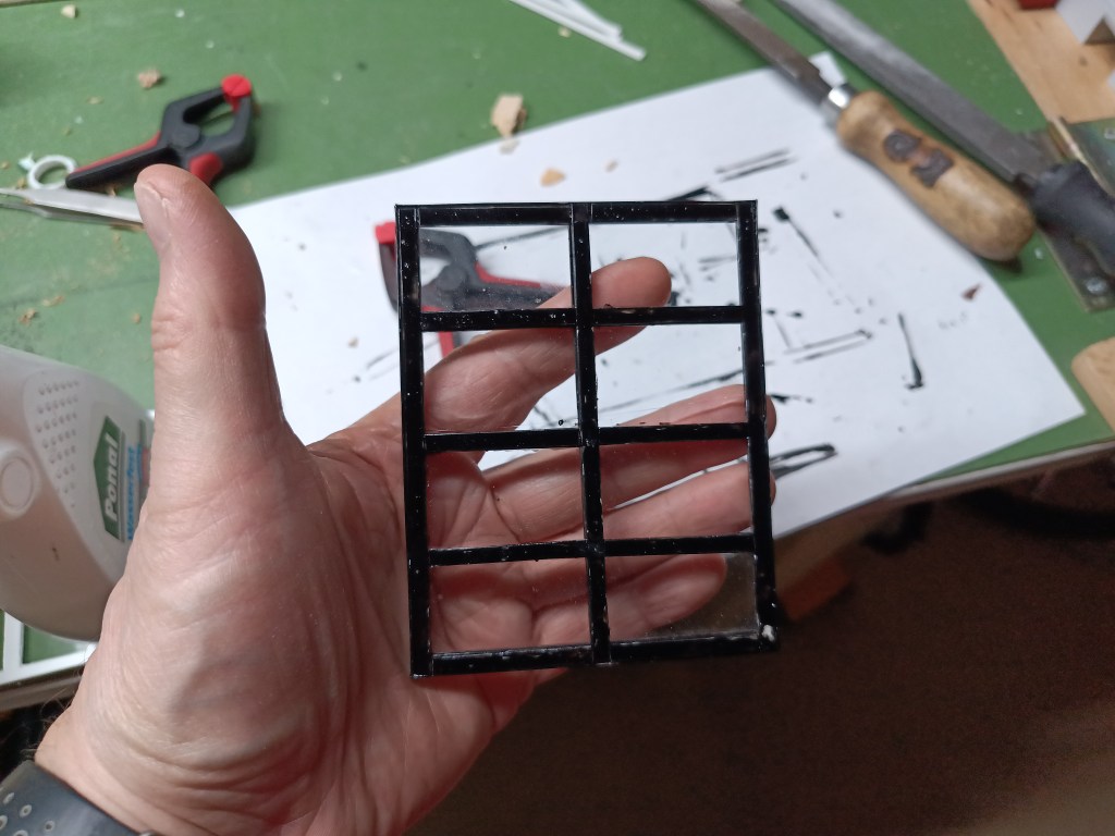 Originally, I wanted to use microscope slides as single glazing there too. However, the slides are only 0.2 mm thick. If the grid frame were to become distorted due to heat or vibration, the slides could slip out of position. That would not be a pretty sight. So, following a tip, I switched to using glass panes from picture frames. These are cut to the size of the frame and then fitted with a grid on both sides to give the appearance of an industrial window. Here is the construction stage after I had cut 4 mm strips from PS sheets and glued them into the frame.