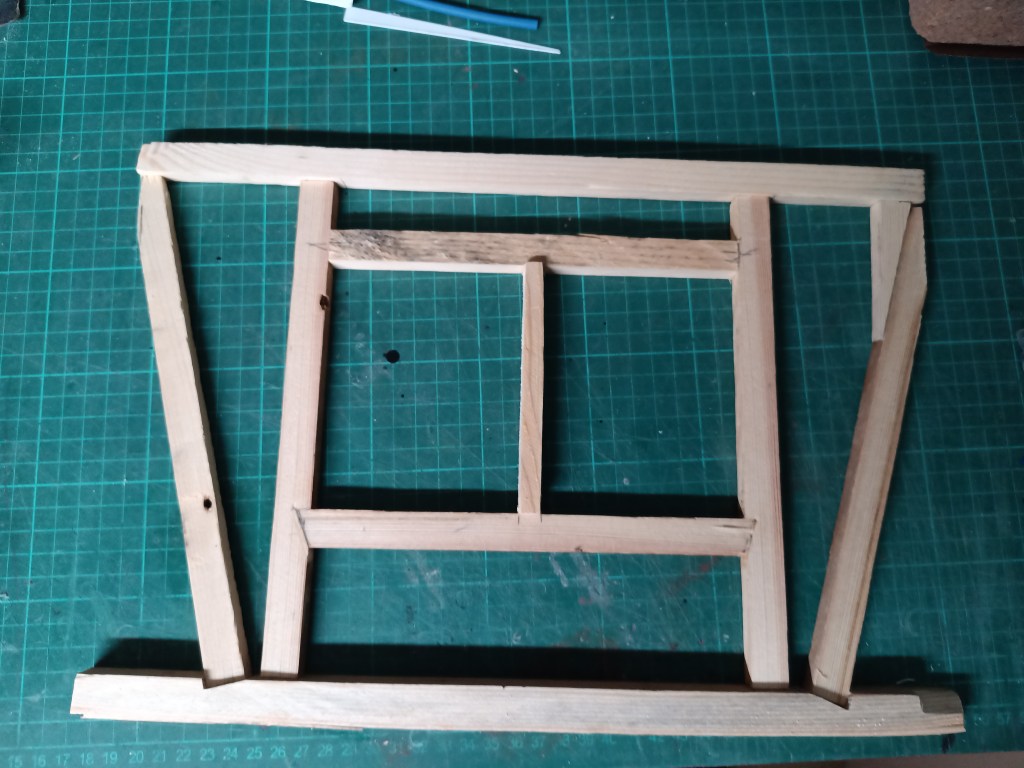 Die Streben sind jeweils einteilig und liegen aufeinander. Das führte leider zu einem Aufwölben des Rahmens (linkes Foto). Für die Rückseite habe ich daher die Sprossen eingepasst und bündig verklebt (rechtes Foto). Eine filigrane und zeitraubende Arbeit.