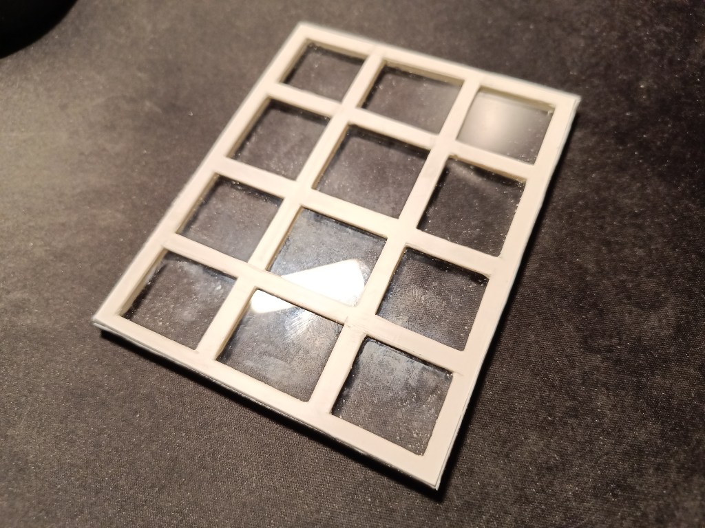 Ursprünglich wollte ich auch dort Mikroskop-Gläser als Einzelverglasung verbauen. Die Scheibchen sind allerdings nur 0,2 mm dick. Würde durch Wärme oder Erschütterung der Gitterrahmen verspannt, könnte die Gläschen aus ihrer Position verrutschen. Das wäre kein schönes Bild. Daher bin ich nach einem Tipp, auf die Glasscheibe eines Bilderrahmens ausgewichen. Das wird auf die Rahmengröße zugeschnitten und erhält dann ein beidseitiges Gitter, um die Optik eines Industriefensters darzustellen. Hier der Bauschritt, nachdem ich 4 mm Streifen aus PS-Platten geschnitten und im Rahmen verklebt hatte.
