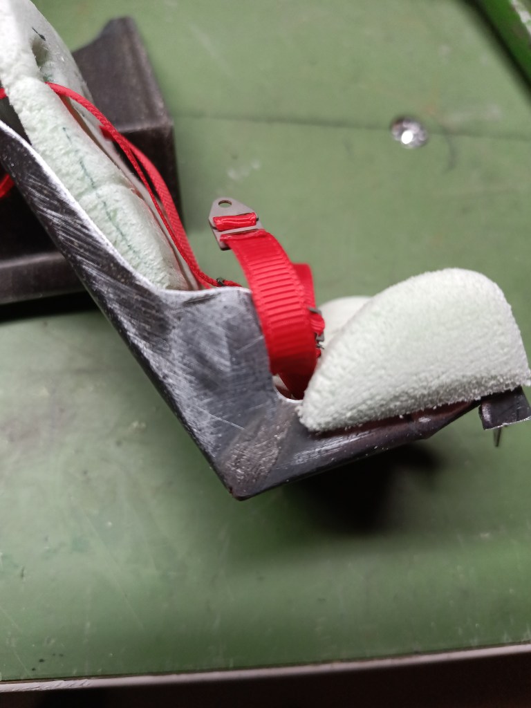 Mit den oberen und seitlichen Gurtführungen ging es weiter. Auch die seitlichen Wangen im Beinbereich wurden geformt. Mit einem Cuttermesser wurden die beiden Teile mittig eingeschnitten. So passen sie auf den Blechrand. Die Gurtführung im Beckenbereich muss ich noch etwas breiter ausarbeiten.