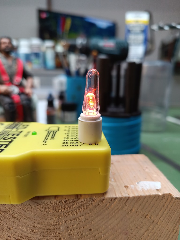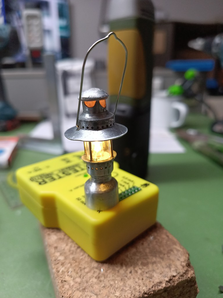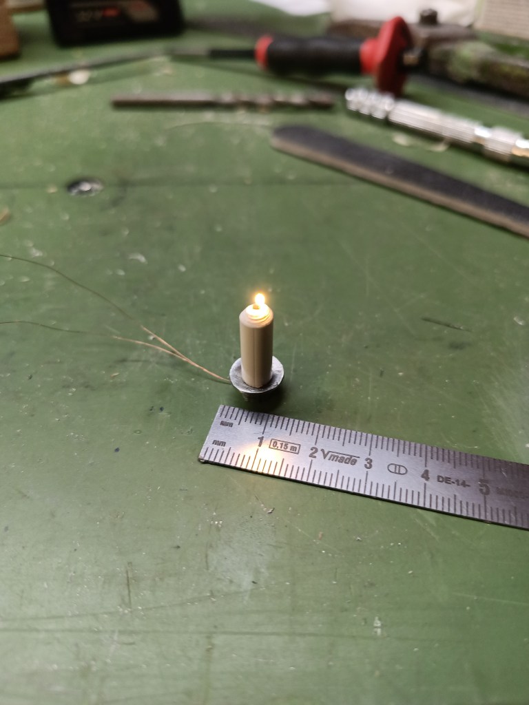 Life also takes place in the dark, so light would be the next topic. The first attempt began with a 5 mm plastic rod. A wax rim and drops were applied to the upper edge with a fine spatula. A central hole was drilled for the SMD LED cable. A slightly curved plate was soldered onto a base. The result was as follows.
