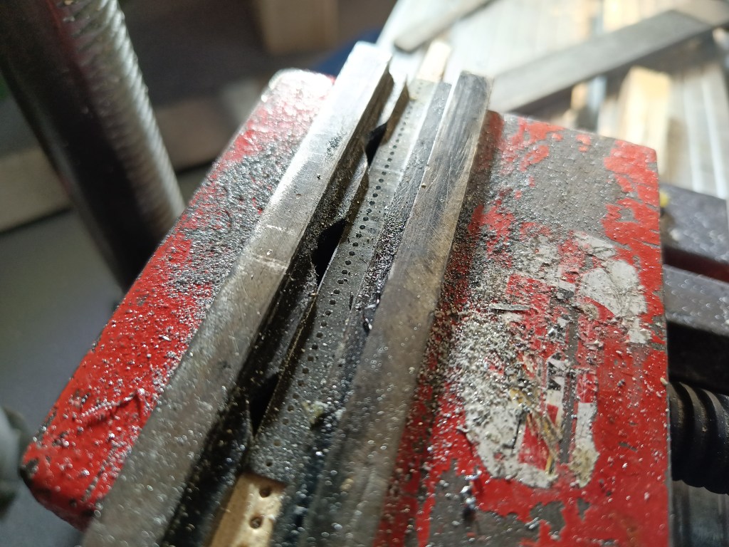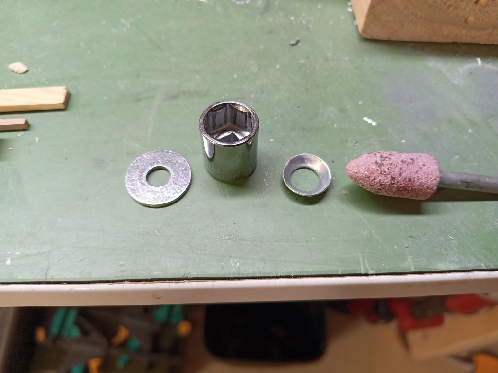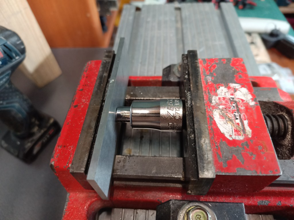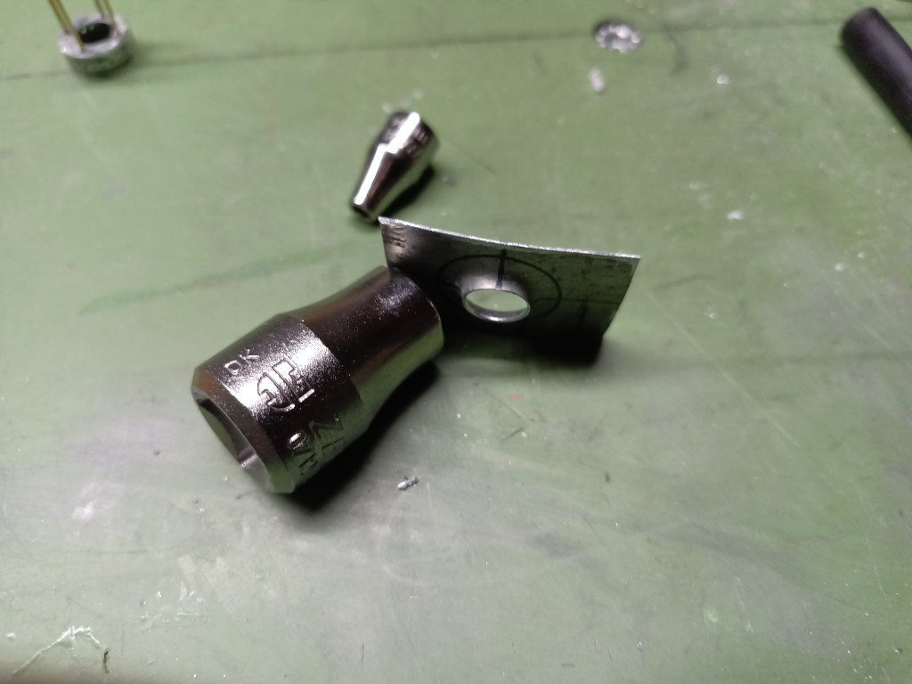 Bevor es weiter geht, einmal meine Schritte, die ich zum Formen der Blechrundungen angewendet habe. Ein auf das Maß einer Stecknuss vorgebohrtes Blech, wird im Schraubstock in eine weitere deutlich größere Stecknuss gepresst.