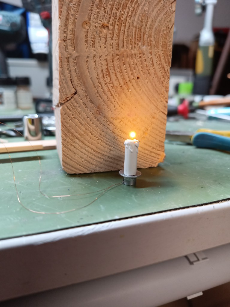 Leben findet auch immer im Dunkeln statt, daher wäre Licht das nächste Thema. Der erste Versuch begann mit einem 5 mm Kunststoffstab. Am oberen Rand wurde mit Feinspachtel ein Wachsrand und Tropfen aufgetragen. Eine zentrale Bohrung für das Kabel der SMD-LED. Auf einem Sockel wurde eine leicht gewölbte Platte aufgelötet. Das so entstandene Ergebnis wie folgt.