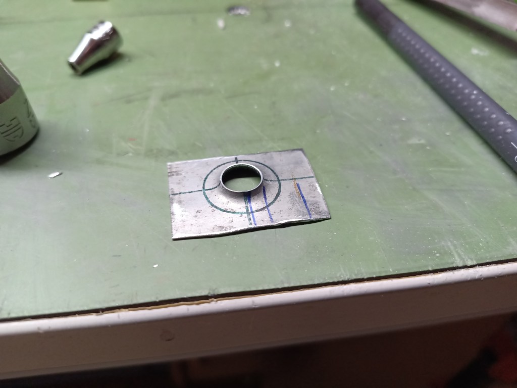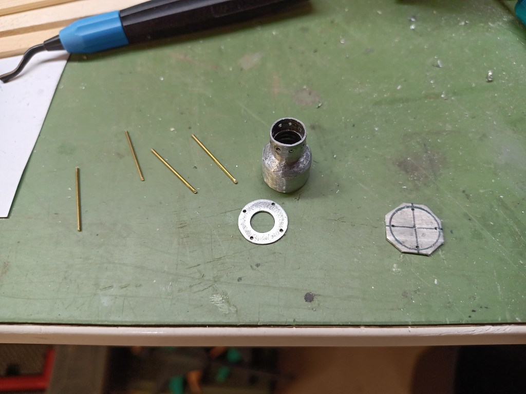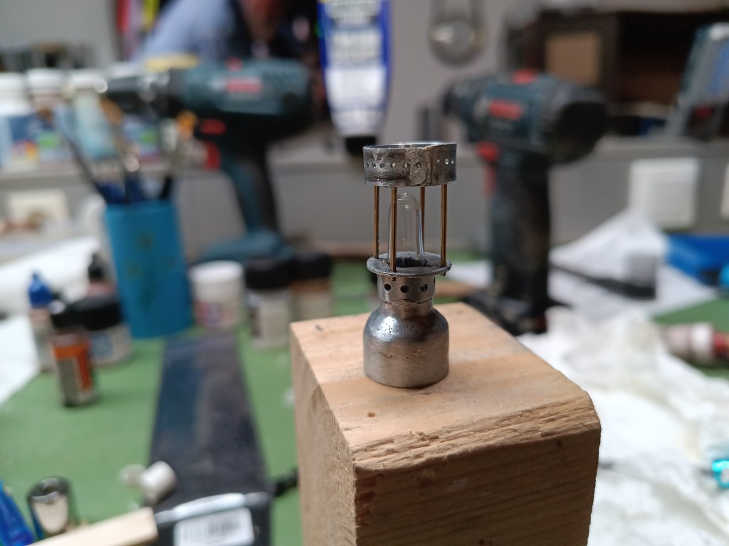 The tank housing was rounded from a strip of zinc sheet. The curve was made from a drilled and cut-out piece. A grinding stone was inserted into the drilled center and driven into a socket nut. The tank is almost finished being soldered. I want to hide a button cell battery in it that lights up an LED.