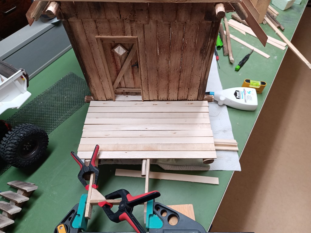 Daher baue ich jetzt noch eine überdachte Veranda an die Hütte. Der Treppenaufgang wird dazu etwas verlegt und die Sitzfläche vergrößert. Zur Schaffung der dafür erforderlichen Voraussetzungen wurden zwei Traghölzer angeschlagen. Improvisiert wirkend, wie schon bei vielen Schritten vorher.