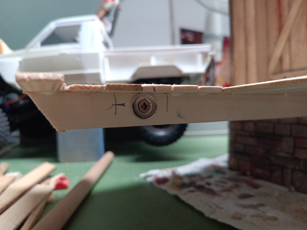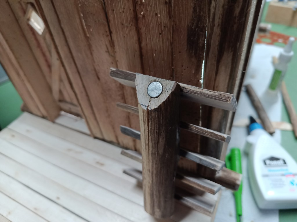 Zur einfachen Montage der Treppe habe ich mich für eine magnetische Befestigung entschieden. Am Tragbalken wurde ein Metallplättchen befestigt…