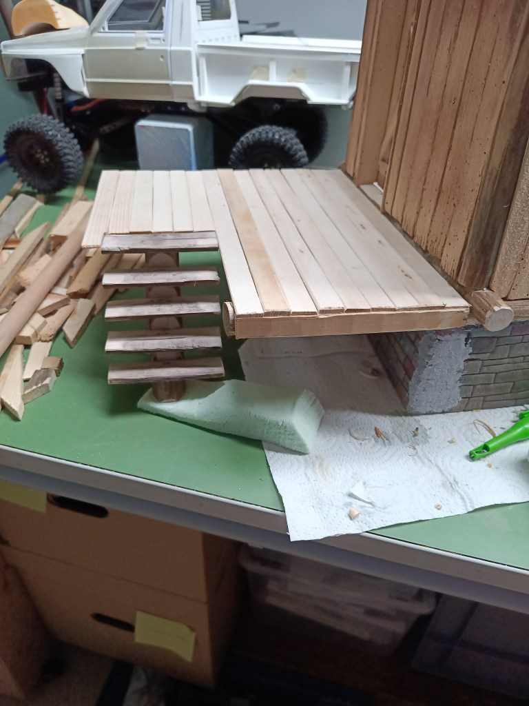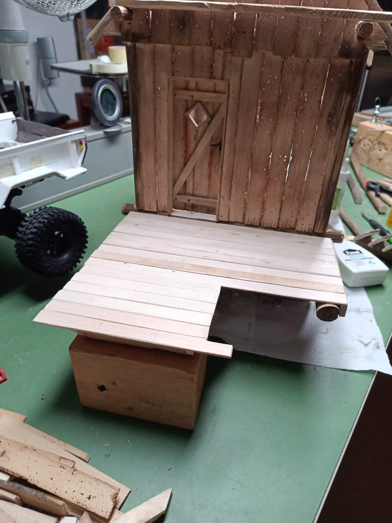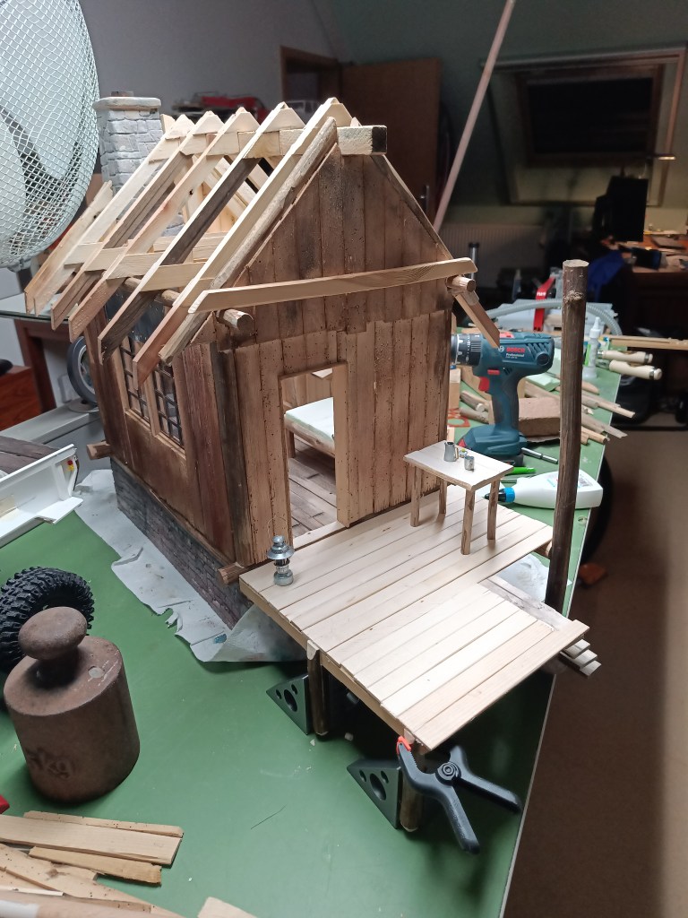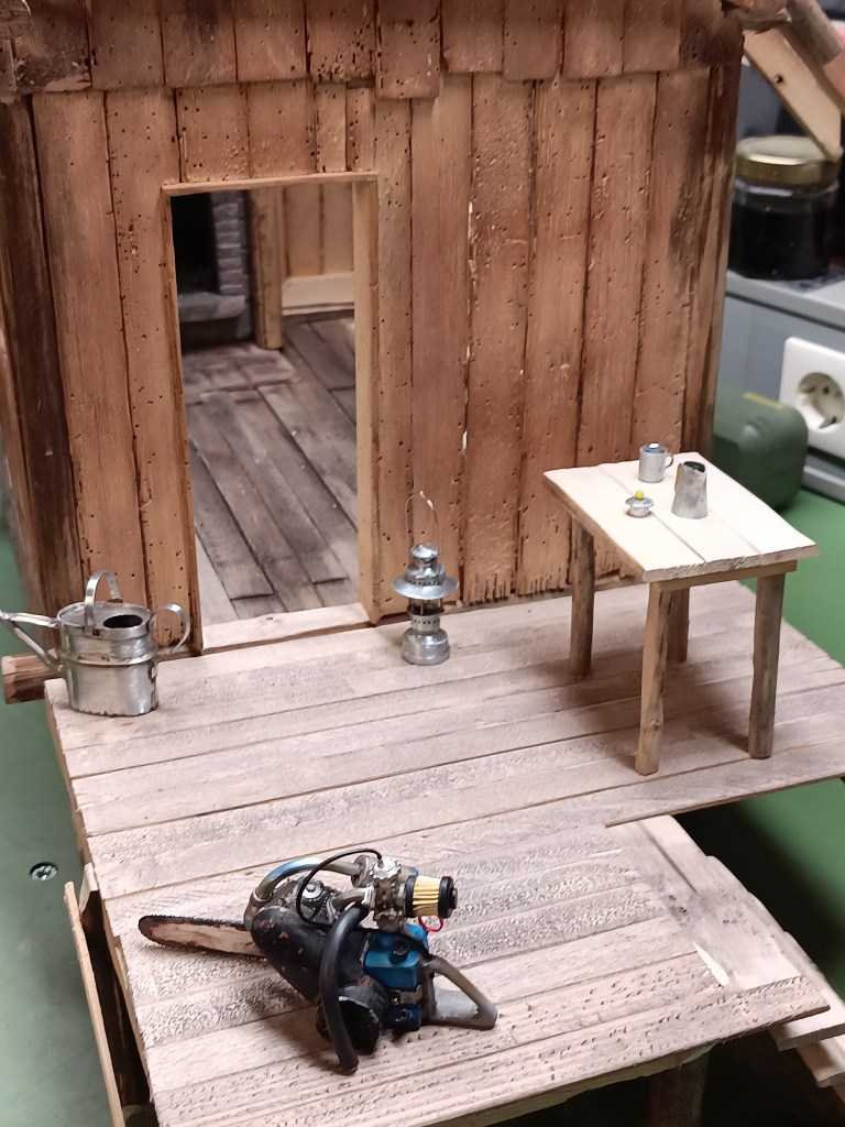 Beim Bau eines Modellhauses erinnert man sich auch an Dinge die einem selbst Freude bereiten würden. Etwas um die Lebensqualität zu verbessern, auch in einer einfachen Behausung. Der vorhandene Platz ist ja schon auf ein Minimum beschränkt. Immerhin geht es ja im Wesentlichen darum ein Dach über dem Kopf zu haben und nicht ein komfortables Wohnhaus zu bauen. Einmal überdacht in der frischen Luft sitzen und seine Blicke ins Umfeld schweifen lassen. Eine Art von Luxus, die zudem nur begrenzte Investitionen erfordert.