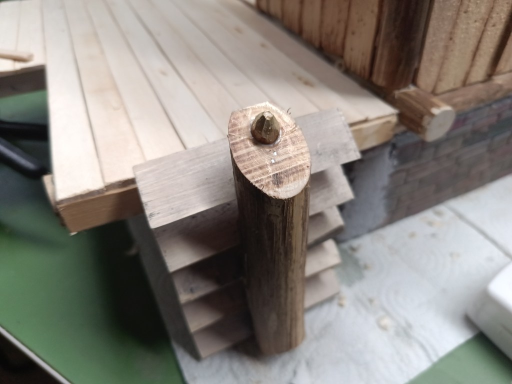 Um den freitragenden Überhang nicht alleine der Schwerkraft zu überlassen, habe ich mit Stützbalken gegengehalten. Links also zunächst 2 Stützpfosten, unten angespitzt.