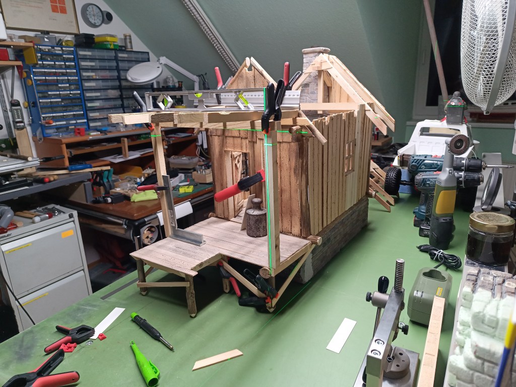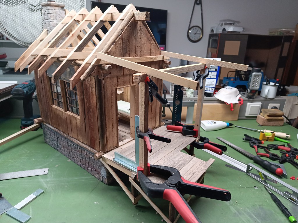Im letzten Beitrag habe ich schon ein Bauteil vorgestellt, das den Auftakt für eine Überdachung der Veranda sicherstellt. Die Dachsparren liegen vorne auf einer Tragkonstruktion aus zwei senkrechten Stützbalken und einem Querträger. Hinten liegen sie auf einem Querträger, der auf den Überständen der Kopfbalken aufliegt.