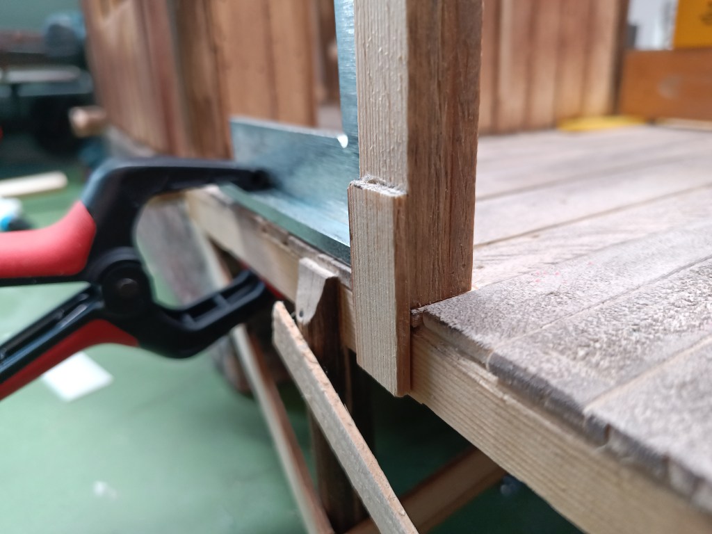 Mit Winkeln zunächst fixiert und dann vernagelt. Zwei eingepasste Rundhölzer versteifen die Konstruktion oben.