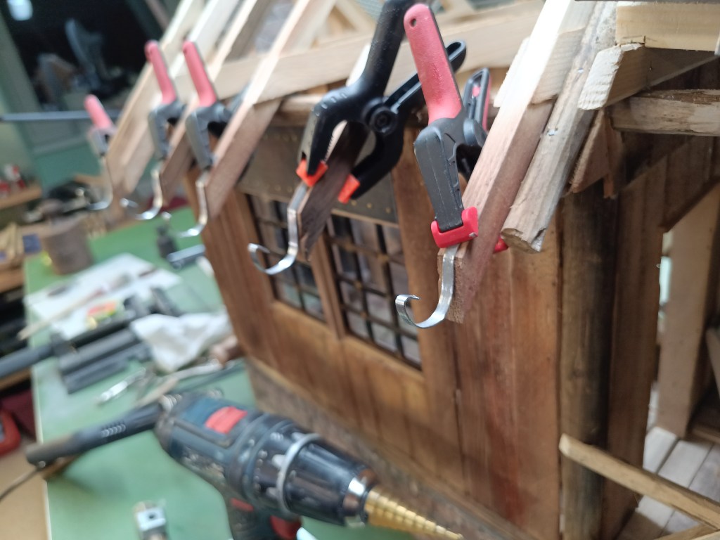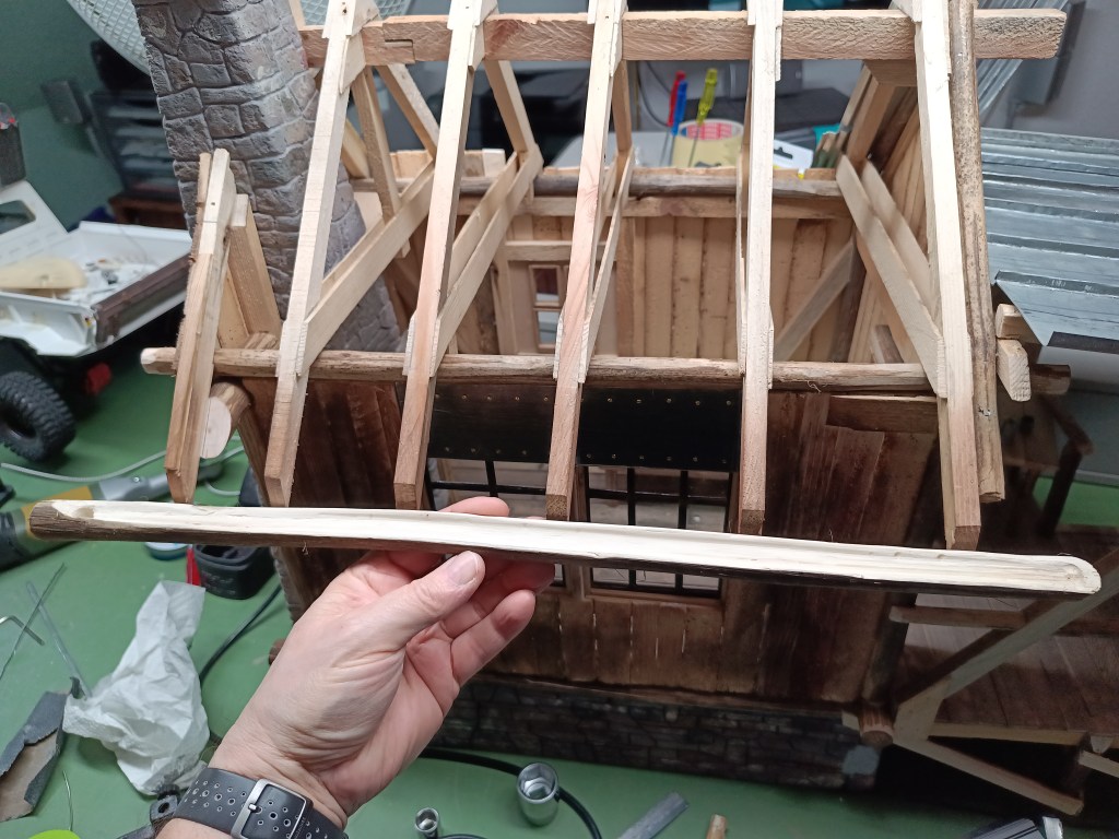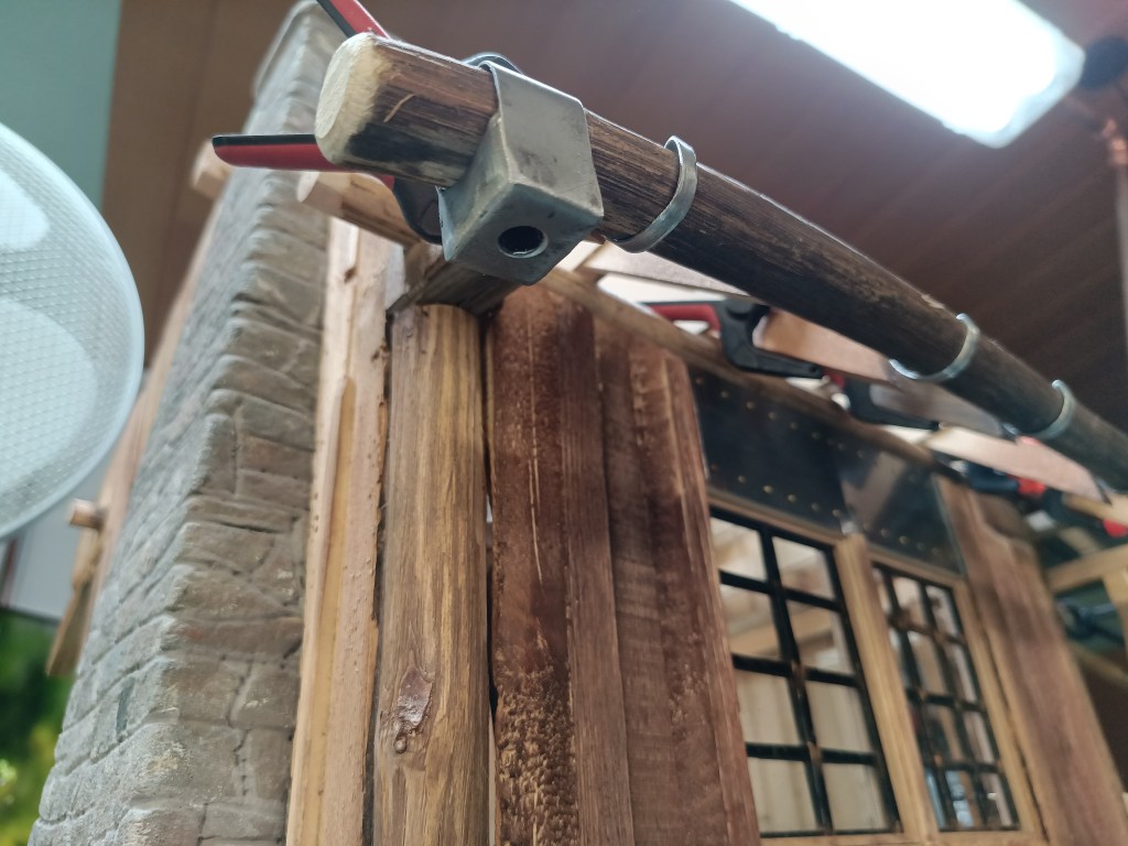I conveniently made the rain gutter from a log. First, I used a chisel to create a flat surface and then hollowed it out with a milling cutter and carving tools. The result is as follows.