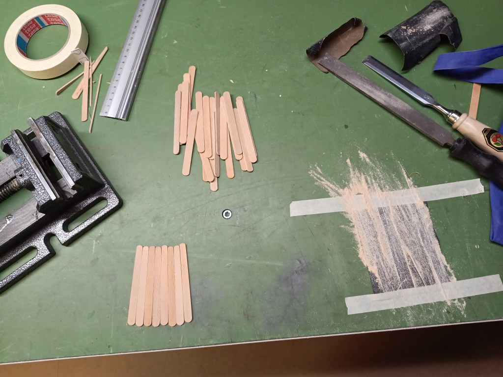 Für das gesammelte Wasser brauchte es auch einen Behälter. Eisstiele wurden dazu leicht konisch angeschliffen.