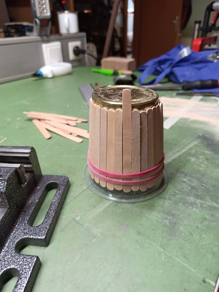 Um die Hölzchen bei der Montage zu fixieren, hatte ich einen flachen Kunststoffbecher ausgewählt. Ein aufgesetztes Glas mit Deckel hielt alles einigermaßen aufrecht. Es war eine richtige Fummelei. Gummibänder hielten solange alles zusammen.