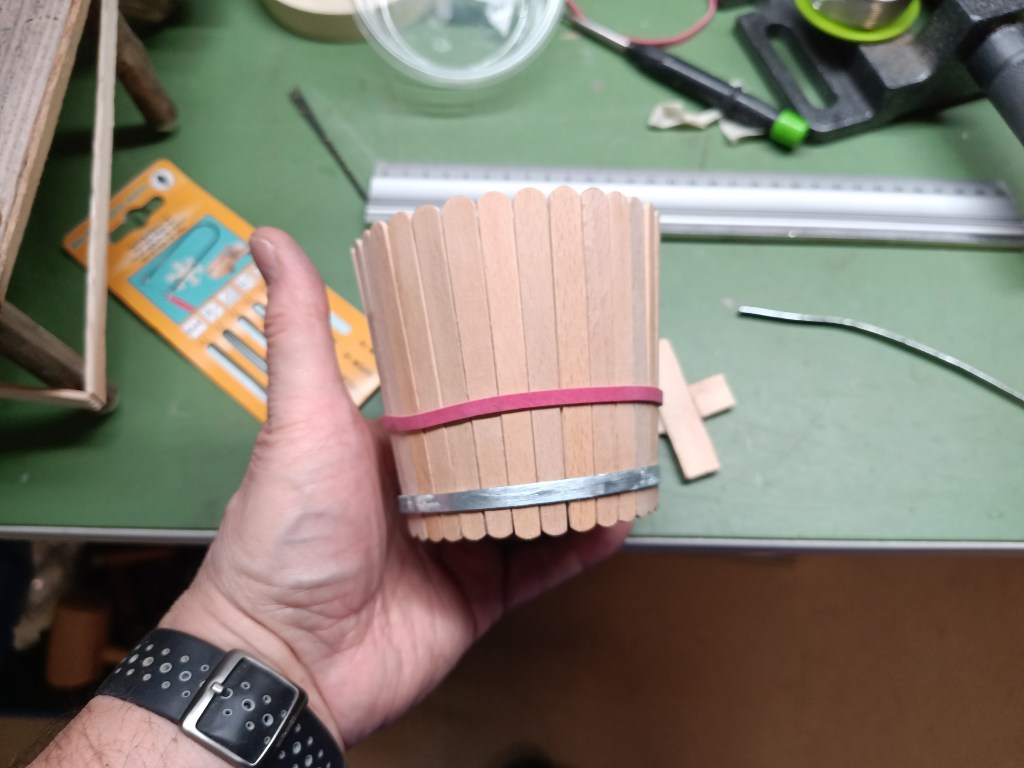 Um für die finale Montage alles zu verbinden, wurden die Hölzchen mit Krepppapier auf der Innenseite verbunden. Oben und unten wurde Holzleim, mit einem Holzstück, in den Fugen verteilt. Die Kanten hatte ich dazu vorher noch angefast. Der dann folgende Aufbau war eine kleine Herausforderung. Den unteren Ring und den Boden ausrichten. Dann das Gebilde langsam rollen und gleichzeitig aufrichten. Über den Boden stülpen, irgendwie aufrecht halten und den Ring hochziehen, bis sich die untere Rundung entwickelt. Vier Hände wären perfekt gewesen, aber mit etwas Fluchen und einem Stoßgebet entstand letztendlich die Kontur.