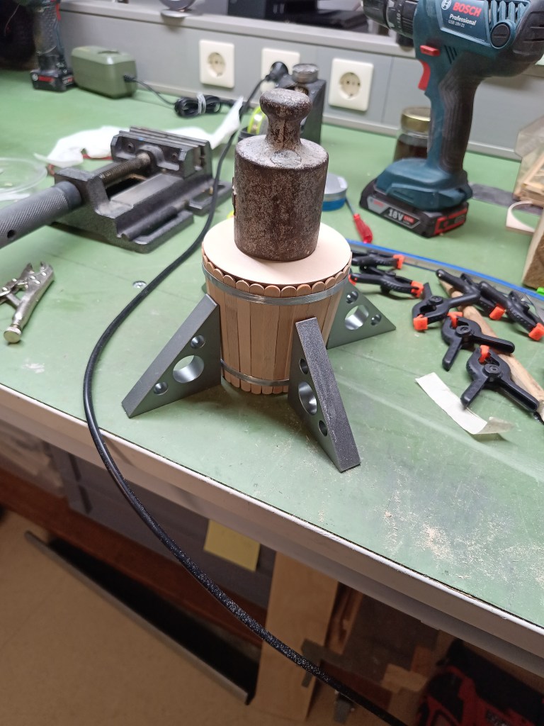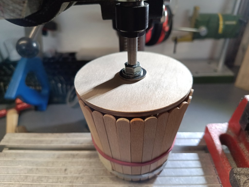 This was then finally stabilized with the upper tension band and the lid. A weight is placed on top to build up the preload so that everything stays in place. It is also important to ensure that the container is evenly shaped. If the glue has not yet hardened, the body can still be twisted and centered.