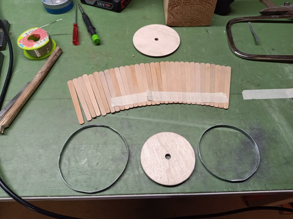 To connect everything for the final assembly, the pieces of wood were joined with crepe paper on the inside. Wood glue was spread in the joints at the top and bottom using a piece of wood. I had touched up the edges beforehand. The subsequent construction was a bit of a challenge. Align the lower ring and the bottom. Then slowly roll the structure and raise it at the same time. Pull it over the base, somehow keep it upright, and pull up the ring until the lower curve develops. Four hands would have been perfect, but with a little swearing and a quick prayer, the contour was finally created.
