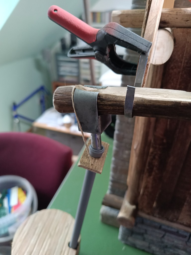So könnte das Wasser nun seinen Weg in den maßstäblich ca. 450 Liter großen Wasserbottich nehmen. Der Deckel erhielt noch eine rustikale Beplankung aus bearbeiteten Eisstielen.