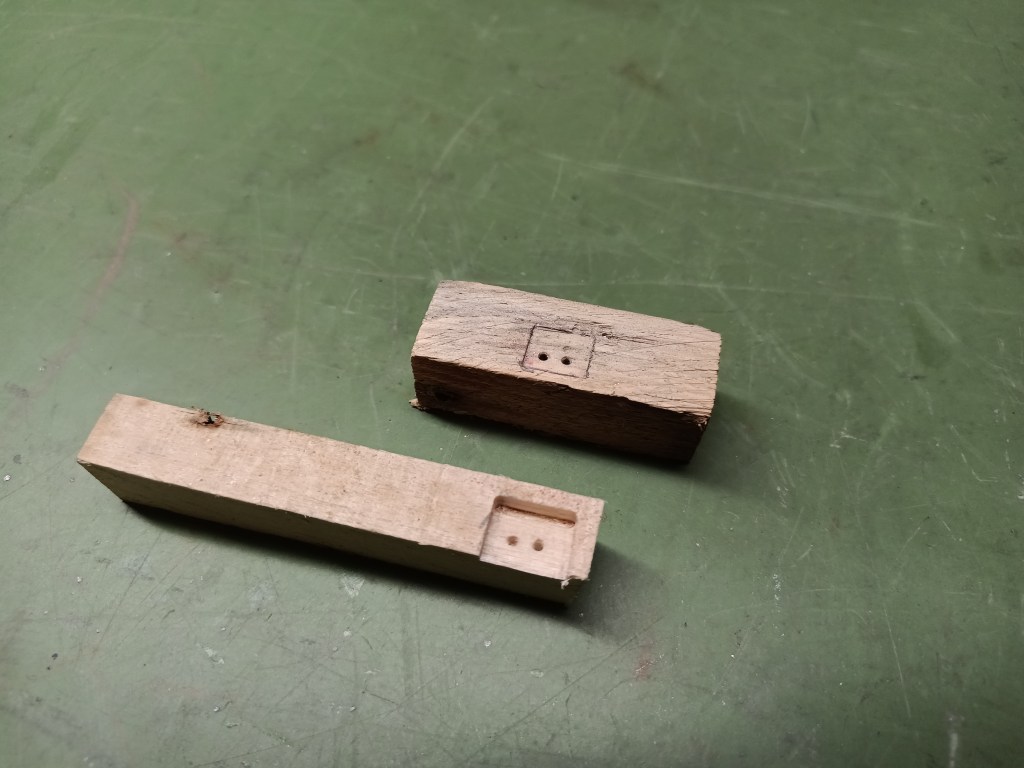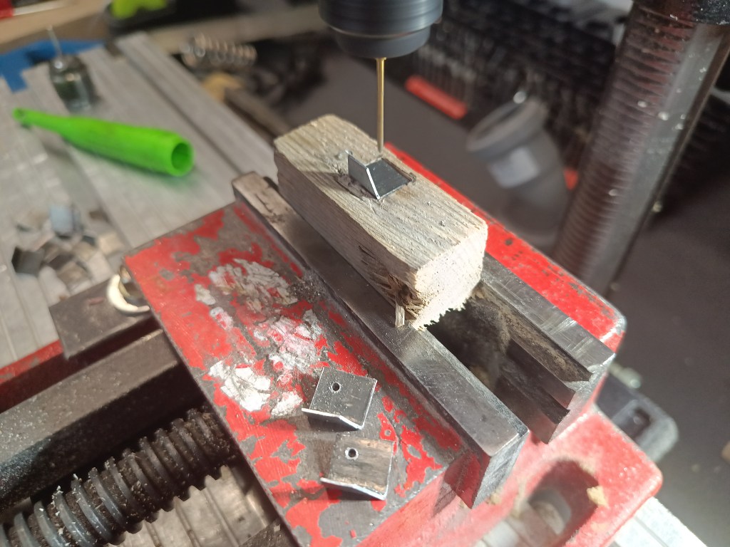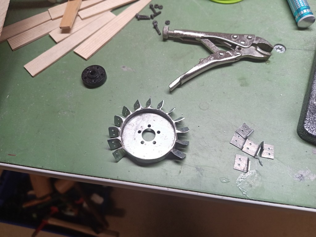 Kleine Metalllaschen wurden hergestellt und gebogen. An ihnen werden die Flügelblätter befestigt.