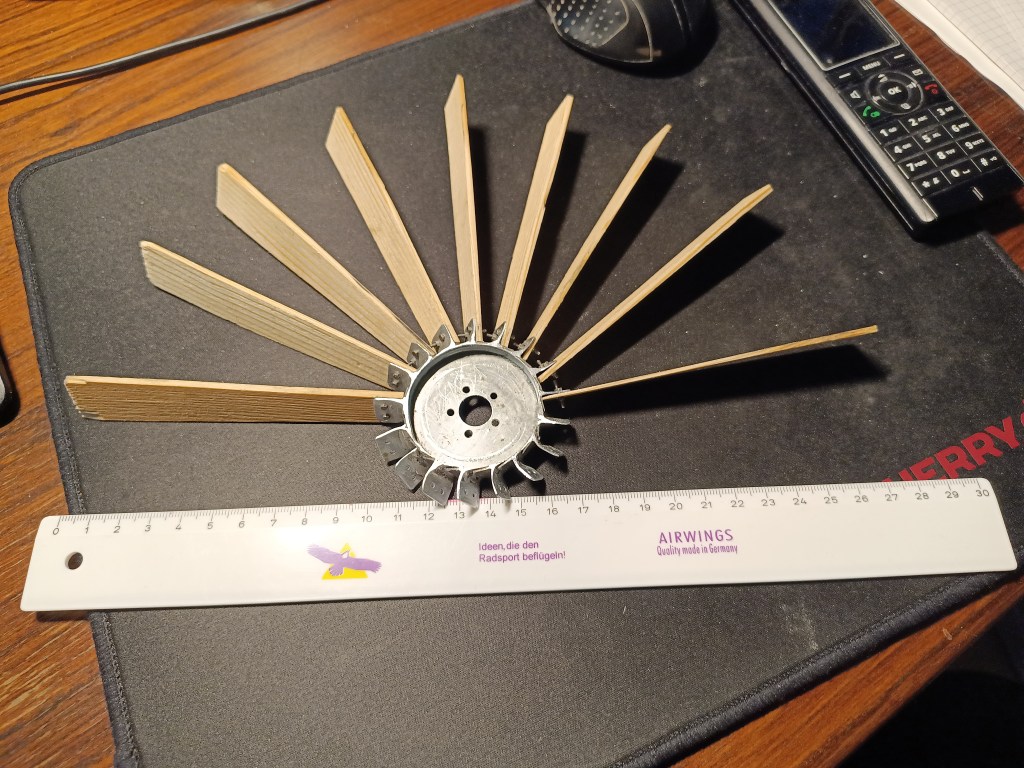 … und die Flügelblätter angeschraubt. Schrauben und Muttern in M1,2 waren eine sehr starke Herausforderung an das Durchhaltevermögen. Die Hauptakteure dabei zwei Pinzetten, eine davon feststellbar. Es war ein schwer zu beschreibender Aufwand, in dem schmalen Zwischenraum alles zusammenzubringen. Das Nervenkostüm war dabei schon mehrmals im dunkelroten Bereich.