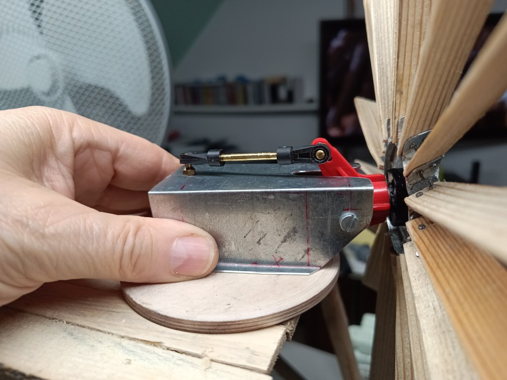 Aus Blech gekantet, das Gehäuse für die Lagerung des Windrades. Weiterhin ein Tamiya Radträger, der mit Kugelköpfen winklig zum Gehäuse montiert ist. So sind noch minimale Anpassungen beim späteren Ausrichten möglich.