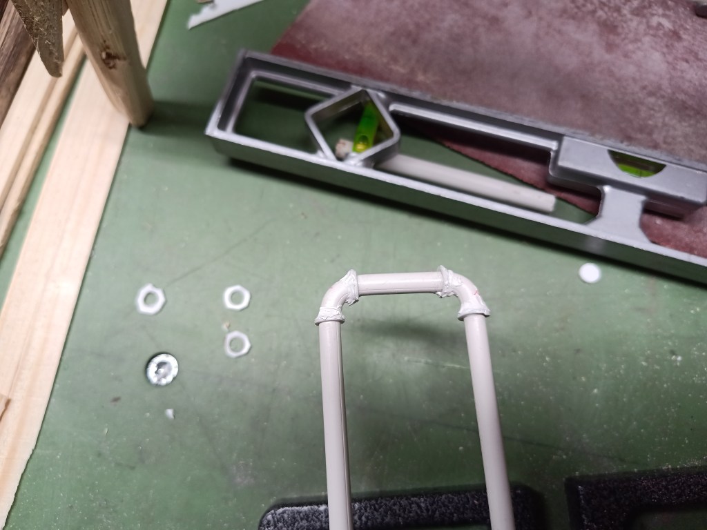 A DN65 riser pipe fills the water tank. To do this, I bent a plastic rod and glued drilled discs to it. They are supposed to represent the collar of the fittings. I filled in the widening for the thread with Vallejo Plastic Putty. It is very easy to apply and sand.