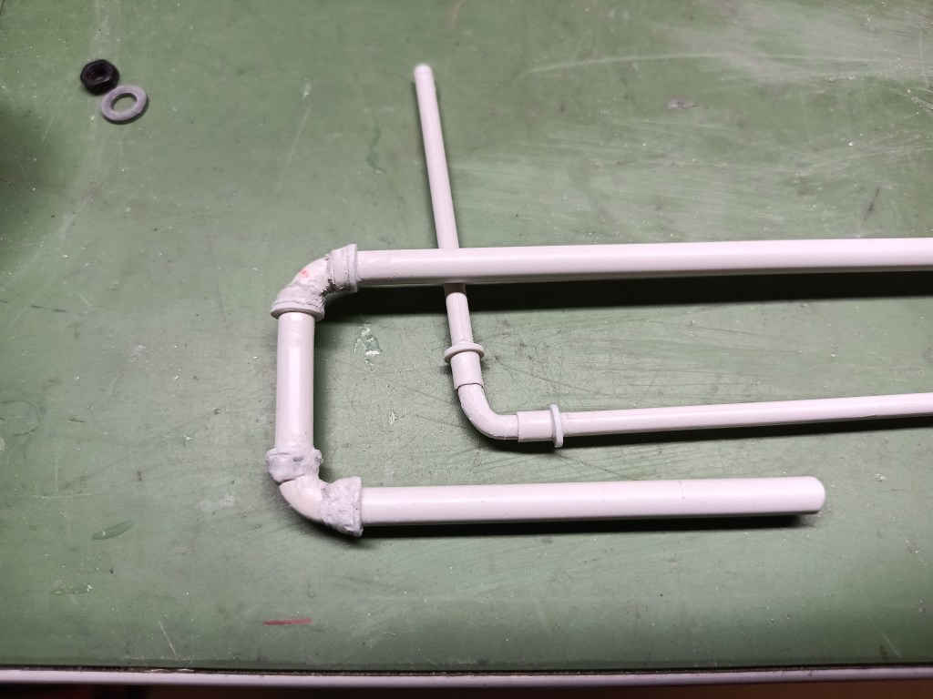 The fittings on the pipes were added purely for aesthetic reasons. Two different methods were chosen for this. Both variants began with bending the pipe by 90 degrees. In one case, a pipe was pushed onto the pre-bent plastic rod and glued in place. This represents the expansion into which the pipe is screwed. Cast fittings usually have an additional reinforcement bead at the start of the thread. Pipe threads taper towards the rear and are almost metallically tight when fully screwed in. The reinforcement bead absorbs these forces. This bead was made from 1 mm drilled plastic scraps and glued on.