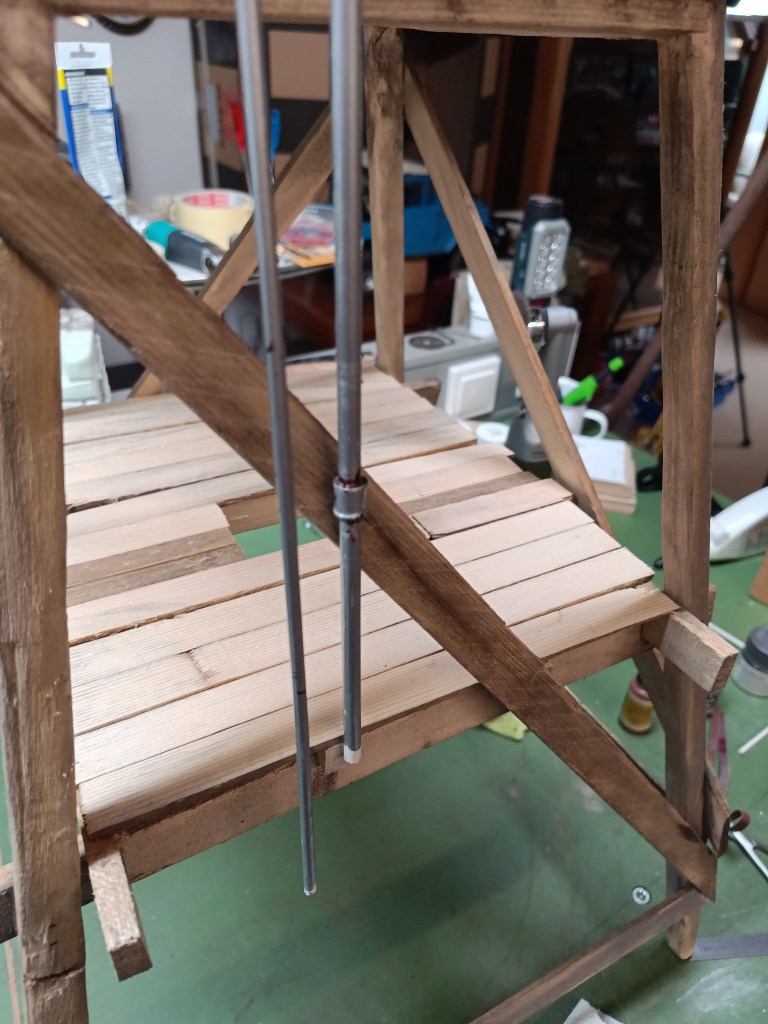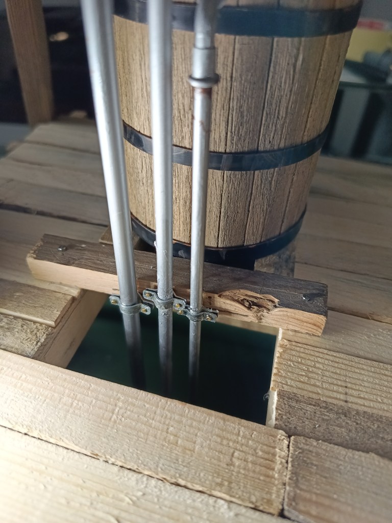 Weiter ging es mit der Baustelle Wasserförderung. Zuerst wurden auch am Wassertank drei Verstärkungsbänder montiert. Sie sind sogar mit Schrauben und Muttern versehen, um die Holzplanken vorzuspannen.
