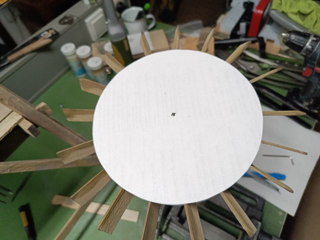 I sanded it down to a width of 5 mm and glued it into grooves sawn into the wing wheels. I made a paper template to determine the positions of the grooves. This process significantly stabilized the impeller once again.