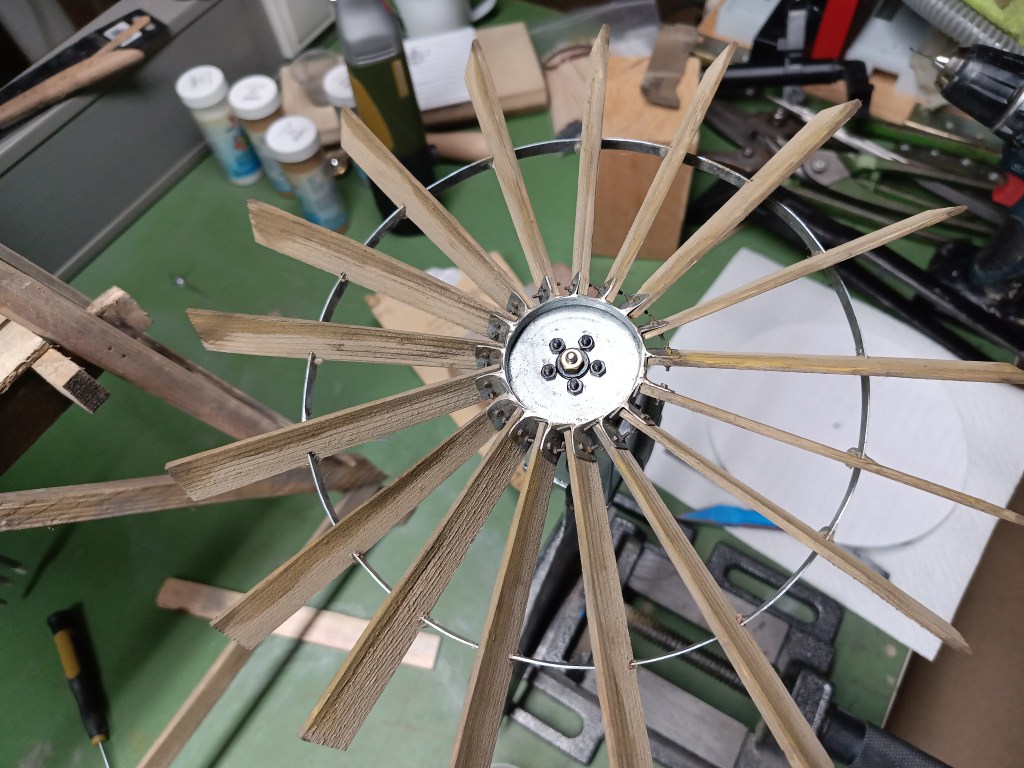 Schließlich habe ich einen weiteren Metallring angefertigt, um die mit filigranen Schräubchen befestigten, dünnen Holz-Rotorblätter zusätzlich zu stabilisieren.