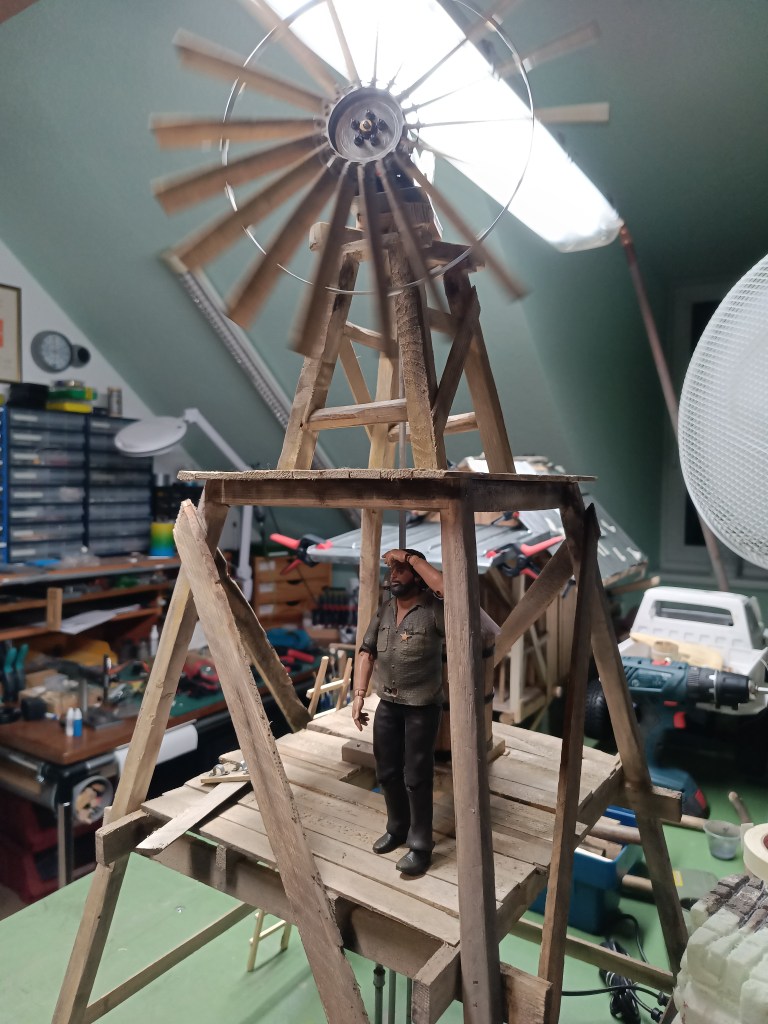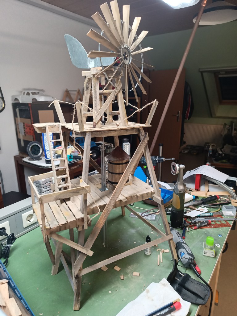 Auch hier hatte ich noch eine Trittfläche für den Austritt montiert. Letztendlich noch einige Pfosten, um gesichert rund um das Windrad laufen zu können. Das als Sicherung vorgesehene, rustikale Naturseil hängt leider nicht schön durch und wird sicher noch gegen etwas realistischeres ausgetauscht.