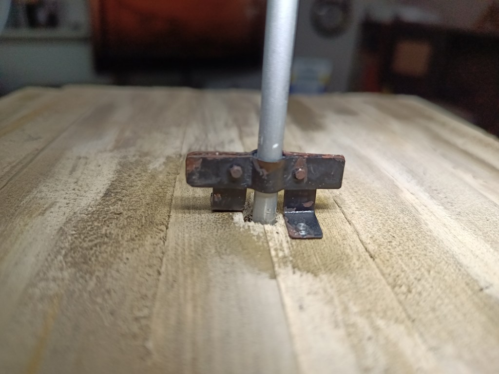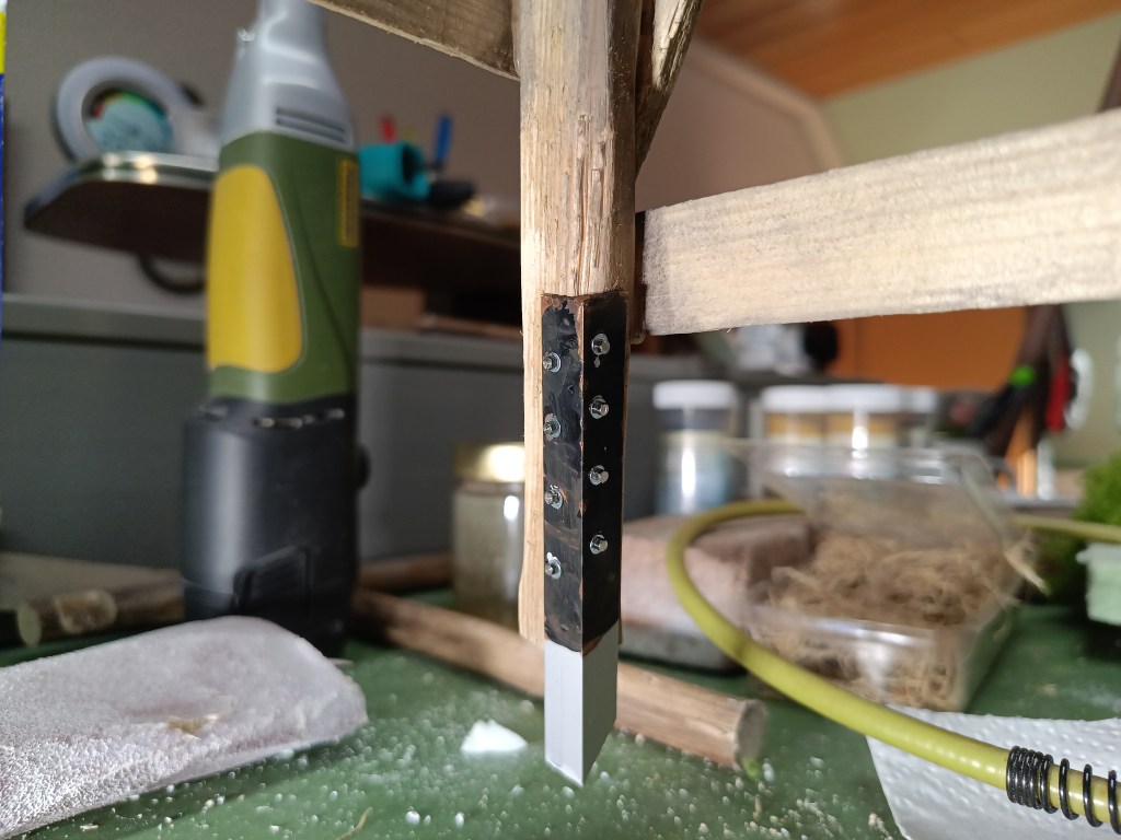 But so far, I’m only there in my mind. I continued with four metal brackets sunk into the ground. Eight screws per mast support ensure a secure footing. The hammer marks are also visible on the ground anchors. There is already some rust.