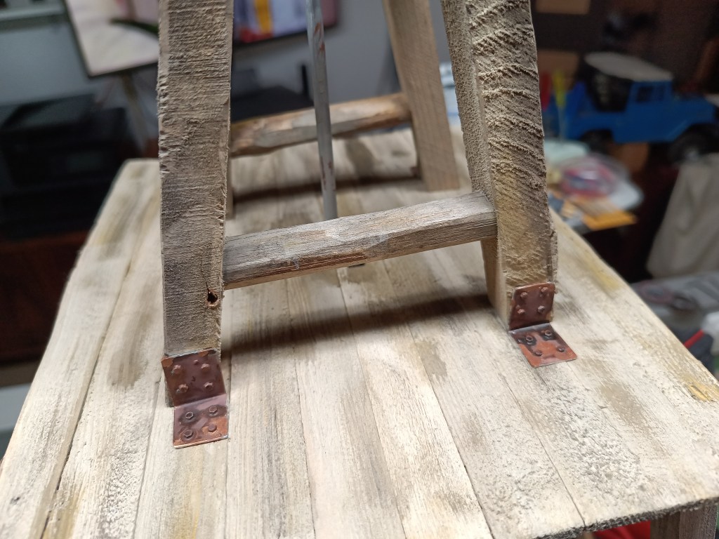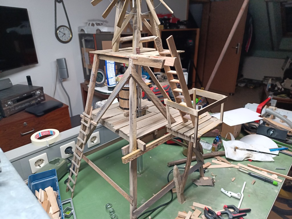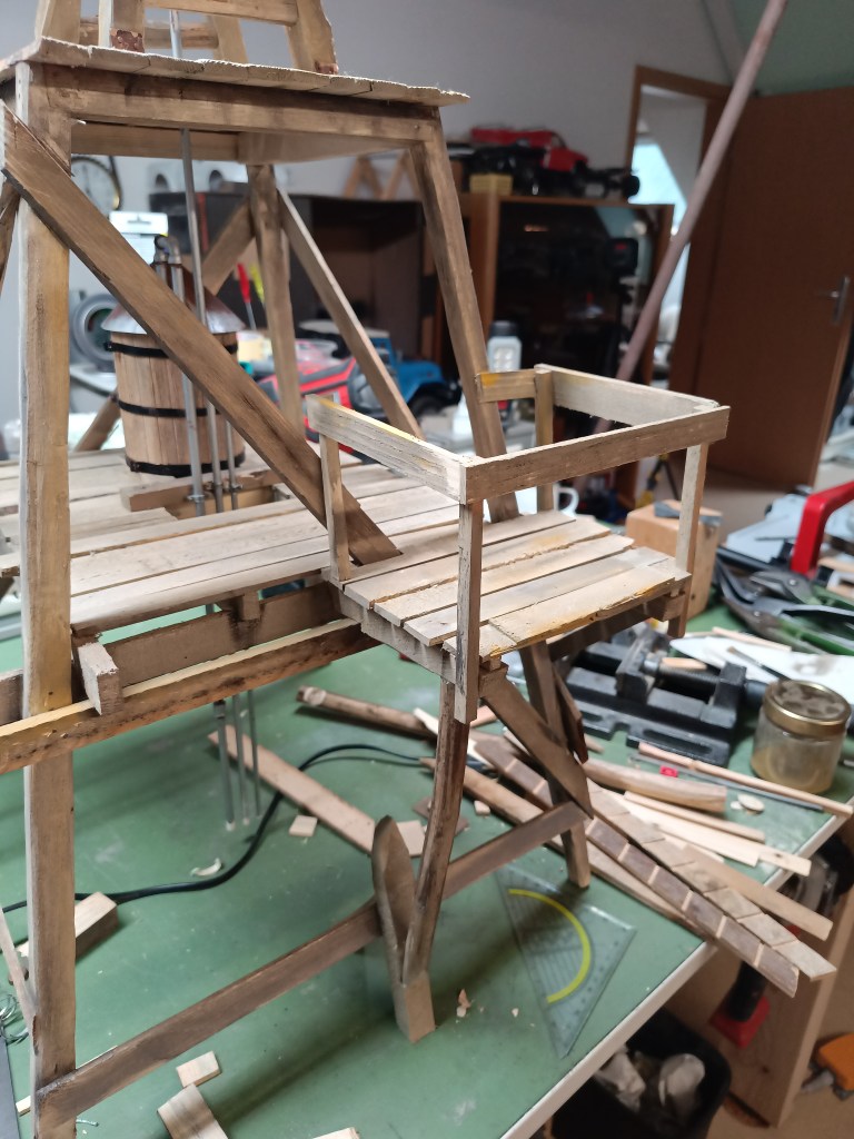 Then I thought of adding another staircase to the rotor platform. A few crossbars were added as a substructure, along with a floor made of boards and a railing.