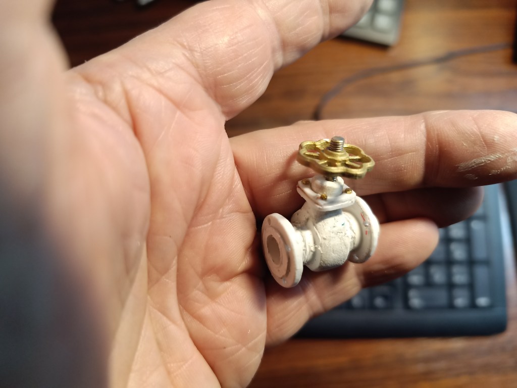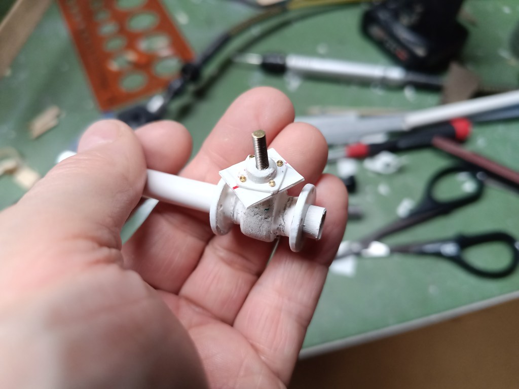 Das Gehäuse wurde mit einem Schleifstift am Dremel in Form gebracht. Eine Schraube M3 diente als Spindel. Ein zugekauftes Messing-Handrad verbesserte die Optik so richtig. Aus Resten von 2,5 mm Kunststoffplatten entstanden die Flansche. Die Maße und Bohrungen wie bei einem Originalteil. Der Schieber hat somit die Dimension DN65. Mit Vallejo Plastic Putty wurden die Übergänge abgerundet.