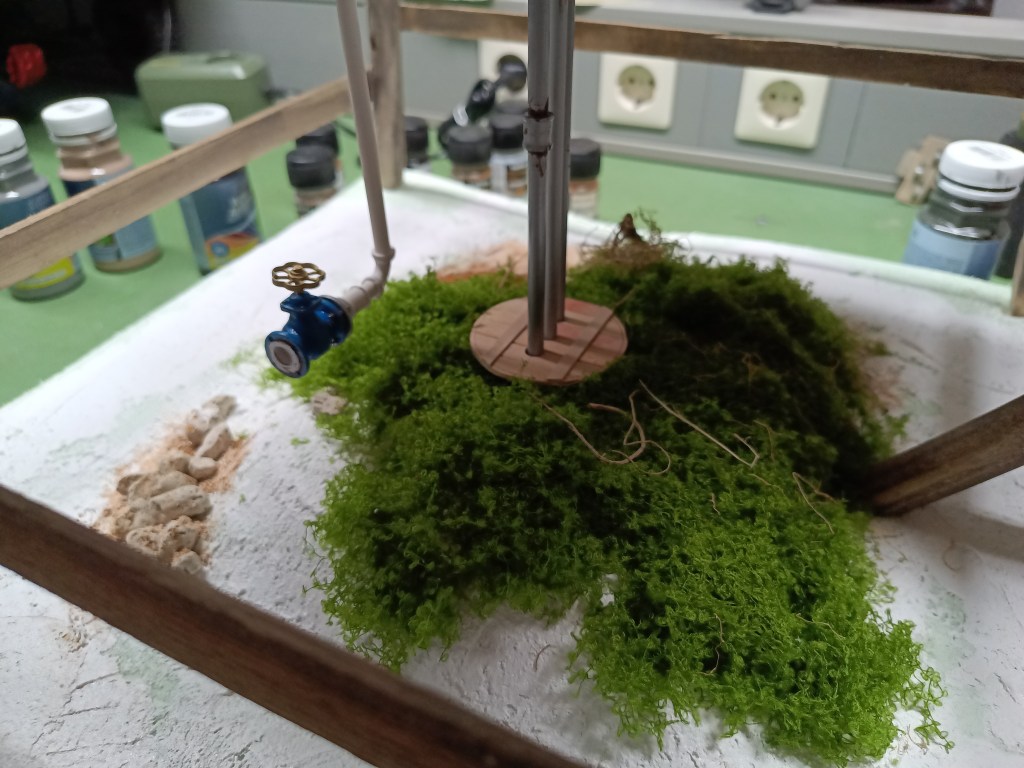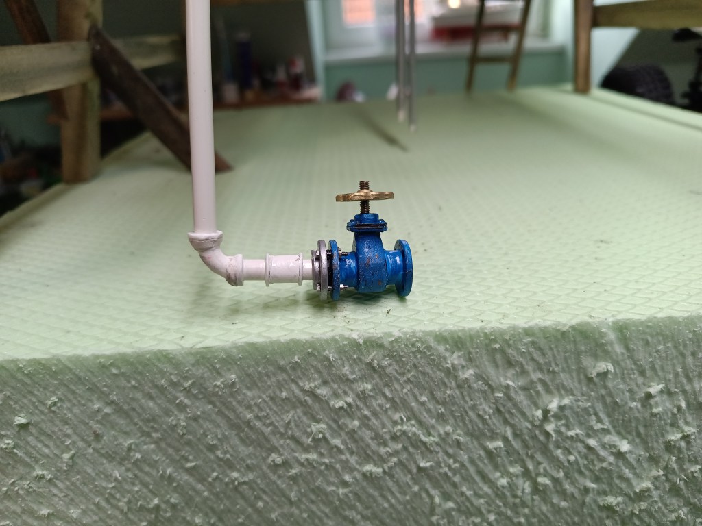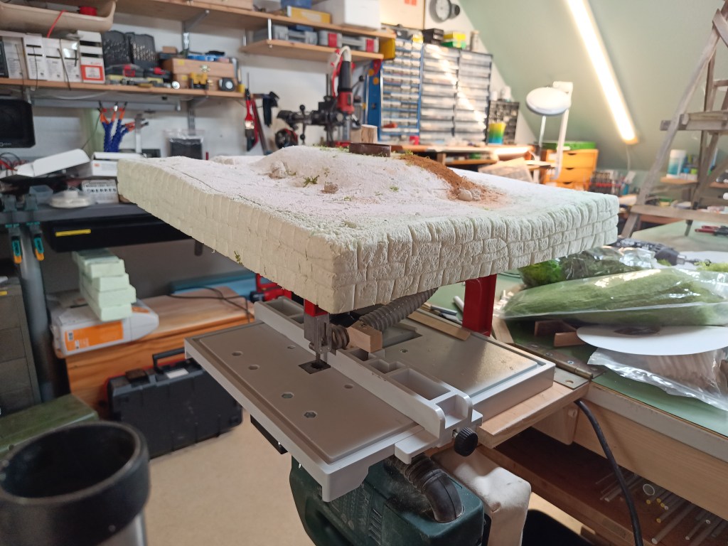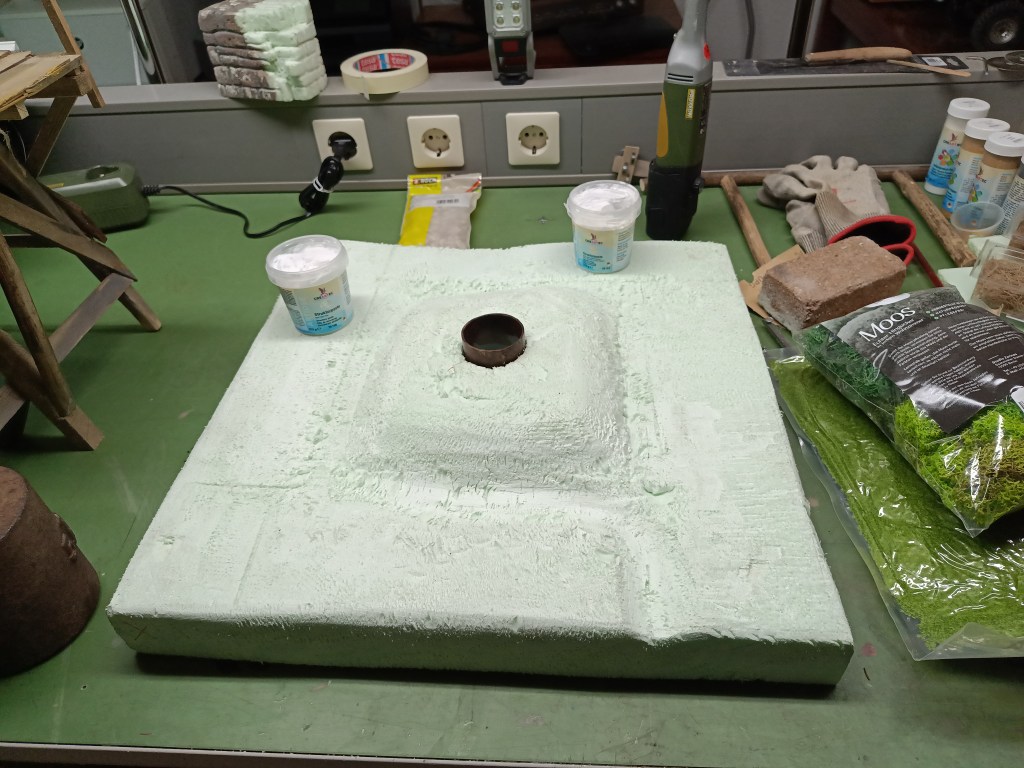 Connected to the pipeline, the result looks like this. The cut-out base plate made of Styrodur is also already visible in the background.