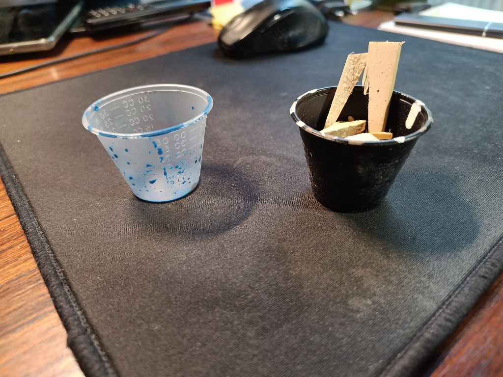 Einer meiner durchsichtigen Farbmischbecher erhielt eine neue Farbe und mutierte zum Behälter für die Anzündhölzer. Er wird neben der Eingangstür auf der Veranda stehen.